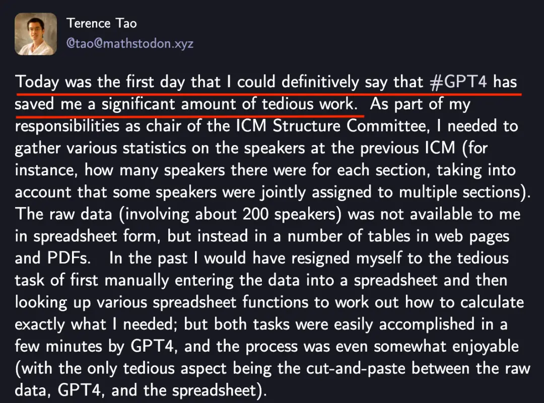 转机出现在GPT-4,陶哲轩尝试使用GPT-4协助处理统计数据,即把原始数据输入电子表格,并查找对应函数、计算所需内容。