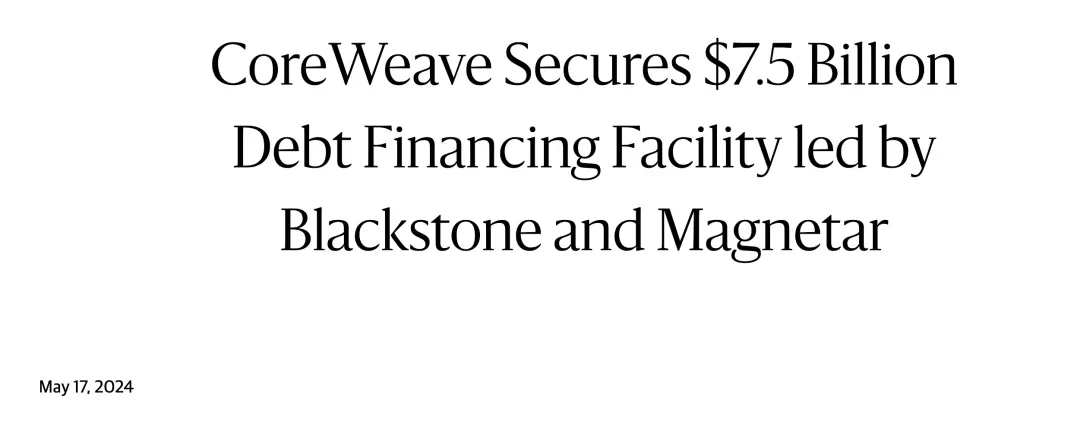 在 2024 年 5 月,CoreWeave 成功签下了一份由 Blackstone (黑石) 牵头的 75 亿美元债务融资工具,这笔钱在私人融资历史上都算得上是最大的交易之一。