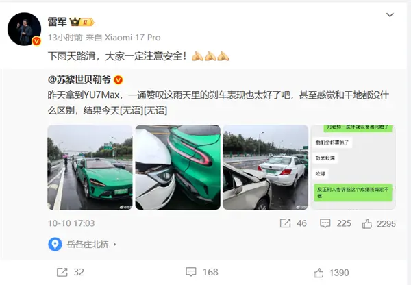 日前,汽车博主@@苏黎世贝勒爷 发微博称,自己刚赞叹完小米YU7 Max在雨天的刹车性能,结果刚说完不久车就被追尾了。“昨天拿到YU7Max,一通赞叹这雨天里的刹车表现也太好了吧,甚至感觉和干地都没什么区别,结果今天……”