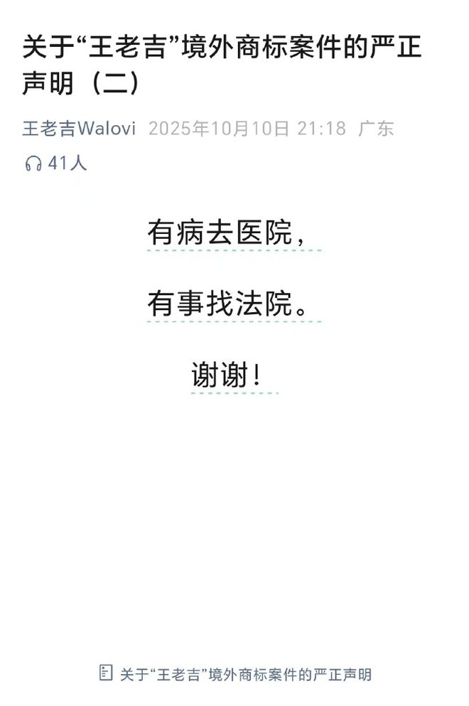 但加多宝显然没打算停手,10月10日又发了一篇《关于海外“王老吉”商标所有权的声明》,再次重申自身立场。这下王老吉的耐心终于消耗殆尽了,于是就有了那经典的十二字回应——“有病去医院,有事找法院”。