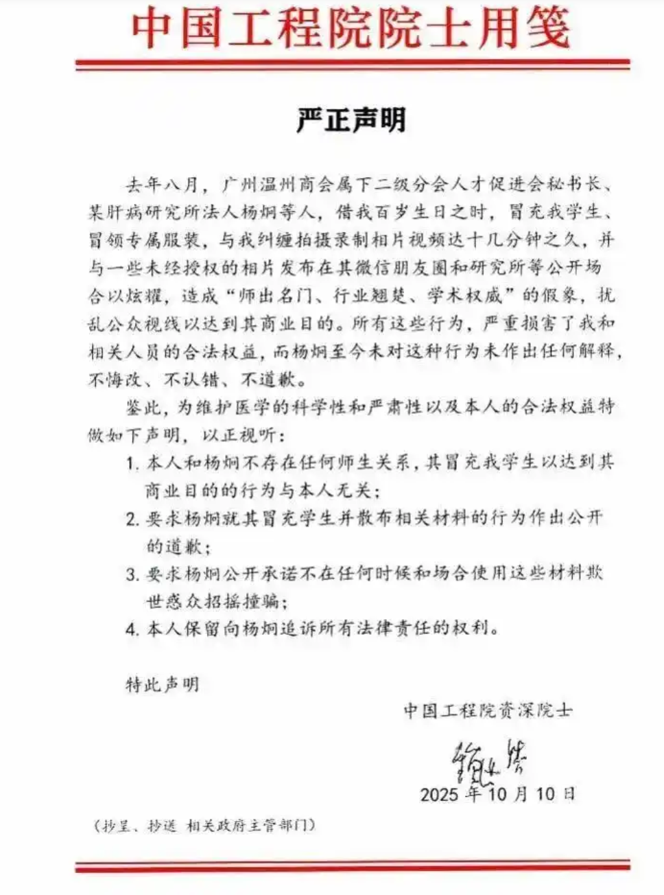 昨日,我国解剖学泰斗、中国工程院院士、中国临床解剖学创始人、中国数字人和数字医学倡导者钟世镇院士办公室发布严正声明。声明中指出其百岁寿辰庆典期间遭5人冒名闯入并违规拍摄影像资料用于不当宣传。