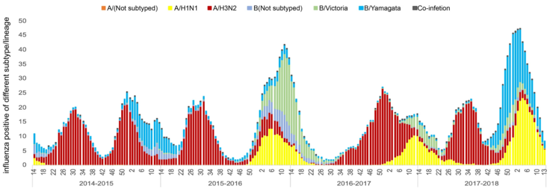 我国既往大部分冬春流感流行季节始于 12 月,1 月达到高峰,随后下降并持续到 3 月。从 2014 年至 2018 年我国流感病毒阳性检出率周分布数据来看,在冬季(第 50 至次年第 11 周)流感病毒阳性检出率最高,其次是夏季(第 23 至第 38 周)、春季(第 12 至第 22 周)和秋季(第 39 至第 48 周)。