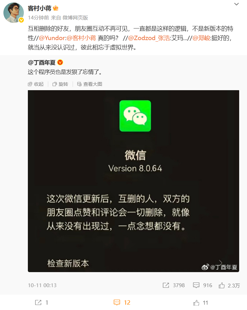对此,微信员工@客村小蒋 发博回应微信互删好友会删除朋友圈所有互动,他表示:互相删除的好友,朋友圈互动不再可见,一直都是这样的逻辑,不是新版本的特性。