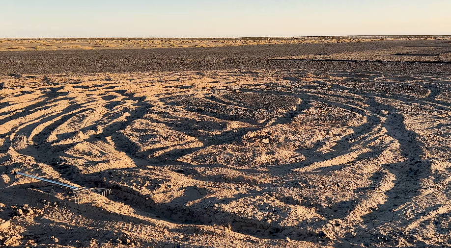 其中 “人民” 二字中间区域受损最严重,沟壑深度达一手之深,地表砾幕层(戈壁生态的保护层)被彻底破坏。
