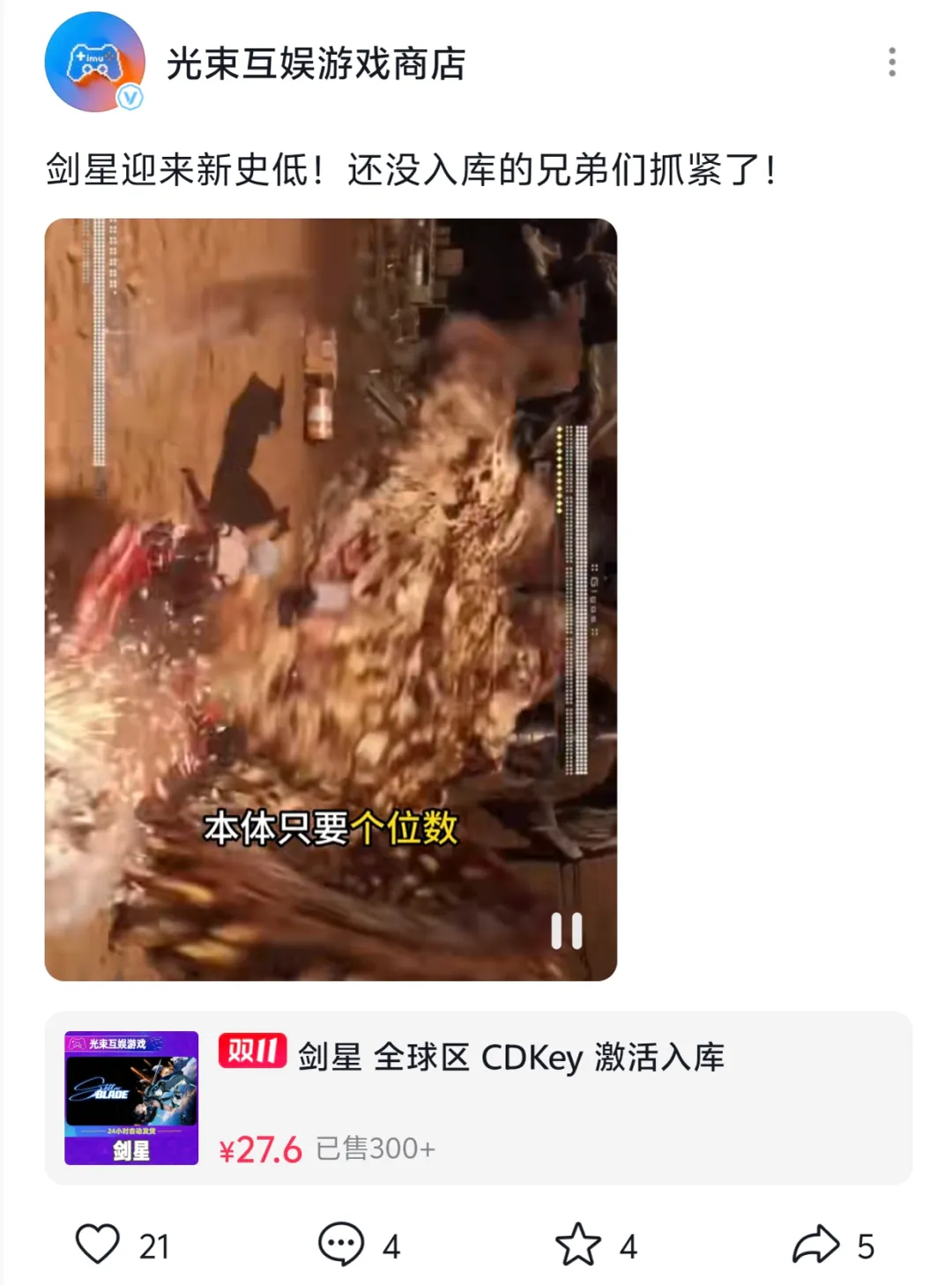 有时候小发刷个抖音,都能看到《 剑星 》史低 5 块钱这种广告。