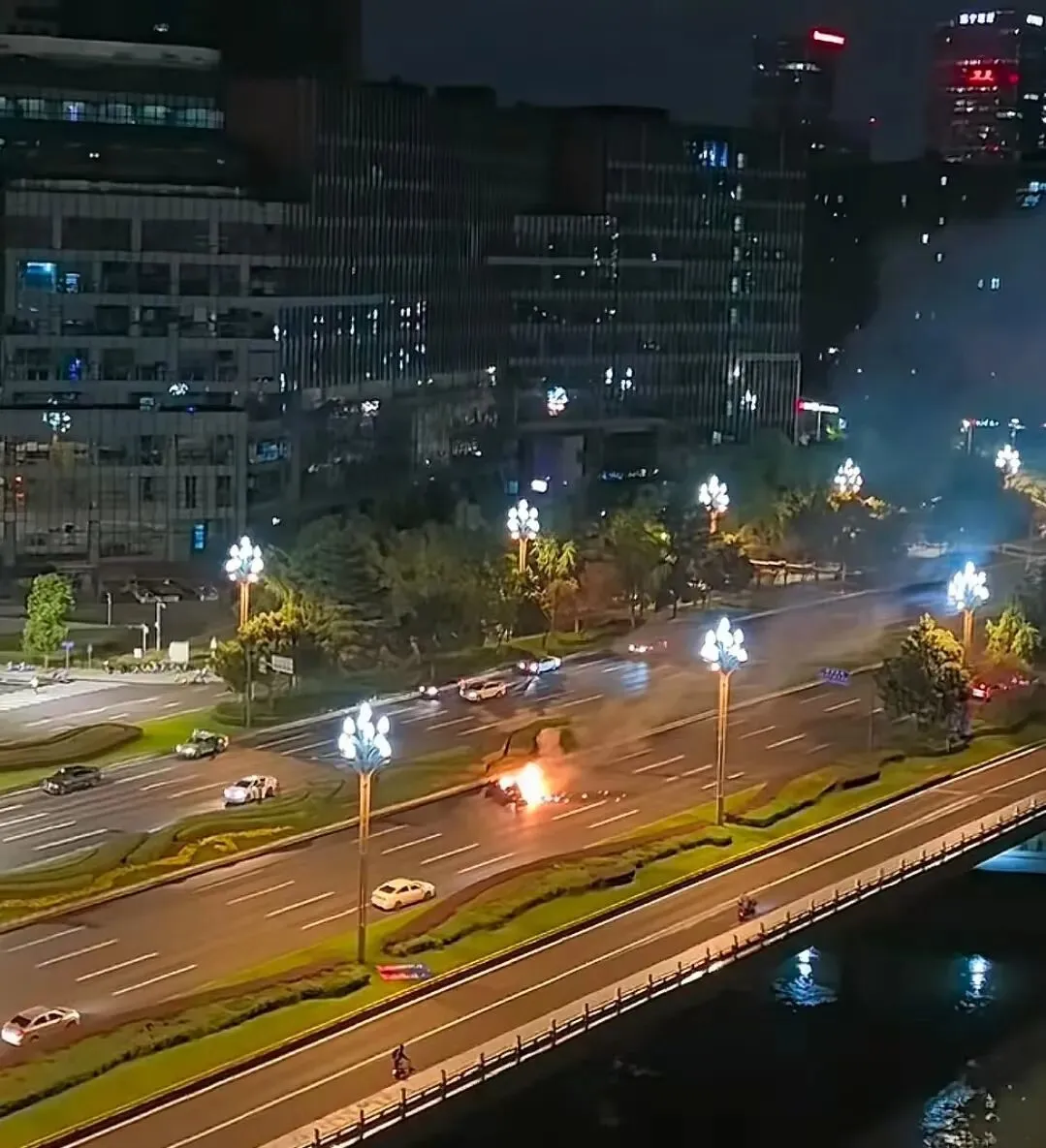 据通报,出事车辆在通过天府五街路口进入天府大道南段后,与前方同向由李某驾驶的川AA****3号小型轿车发生碰撞,随后越过道路中央绿化带,起火燃烧。
