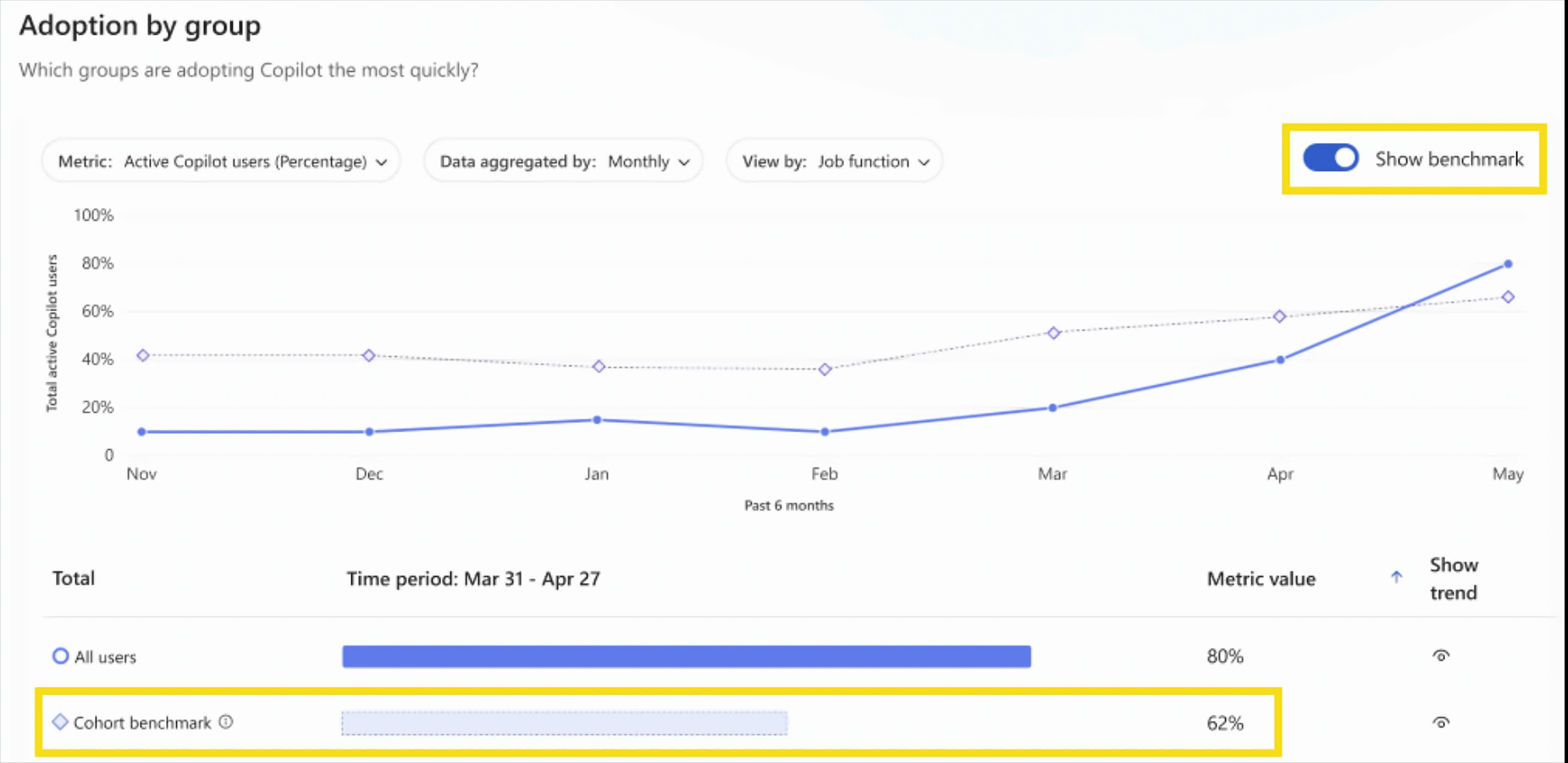 该功能不仅可展示团队之间在Copilot使用方面的差异,还涵盖按管理类型、地区和职位功能的细分数据,包括AI助手用户比例、按应用采用情况和活跃用户复返率。