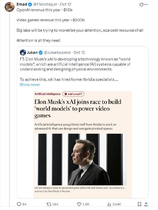 一位网友评论称:“OpenAI今年的收入约为100亿美元。视频游戏行业今年的收入约为2000亿美元。大型实验室将试图将你的注意力——最稀缺的资源——货币化。他们所需要的只是关注。”