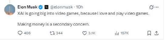 马斯克回应称:“XAI正大举进军视频游戏领域,因为我喜欢玩视频游戏。赚钱是次要的问题。”