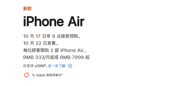 苹果官网更新iPhone Air国行发售信息:10月17日9点预购 22日开售