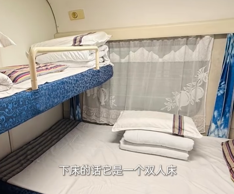 12306工作人员表示,该列车是3人间,包间由1个双人床和1个单人床组成,下层是稍宽一点的双人床,上层是单人床。