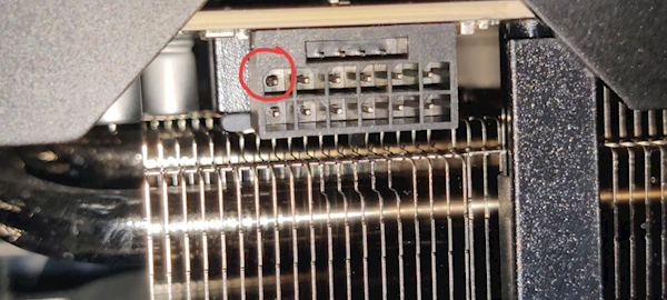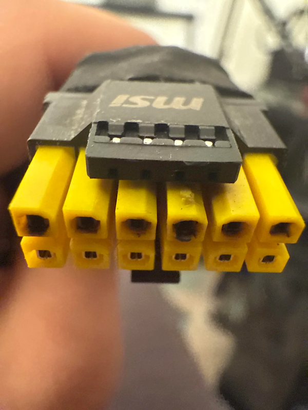 第一例,PNY RTX 5090,先是连续几个星期出现莫名其妙的黑屏、崩溃,最后检查发现供电接口已经烧焦,一整排针脚都废了。