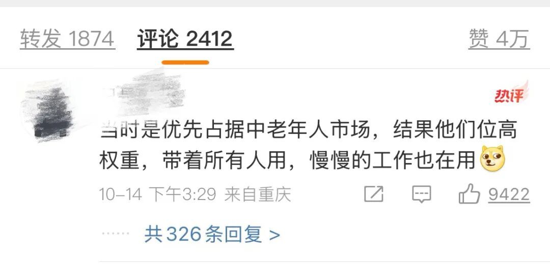 其中,最热的一条微博内容,1000多人转发,2422条评论,4万人点赞(数据截至稿前)。该微博底下最热的一条微博也很让人扎心,“当时是优先占据中老年人市场,结果他们位高权重,带着所有人用,慢慢的工作也在用”,该评论的点赞量达9422次(数据截至稿前)。如果继续往下翻热门评论,也能看到更多年轻人对用微信的“老年人”的嫌弃。