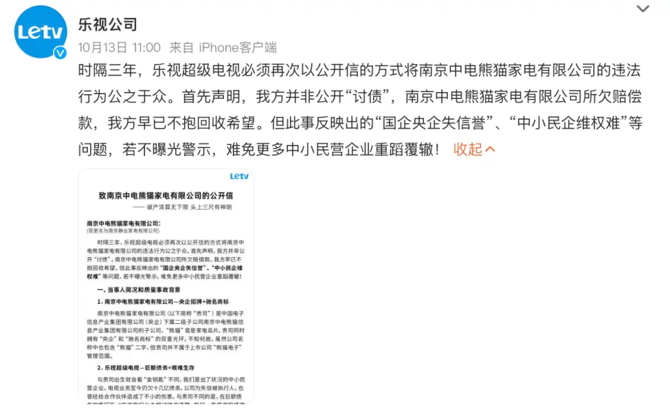 10月13日,乐视公司官博发文,对南京静业家电有限公司(即原南京中电熊猫家电有限公司,简称“中电熊猫家电”)再度进行公开声讨。
