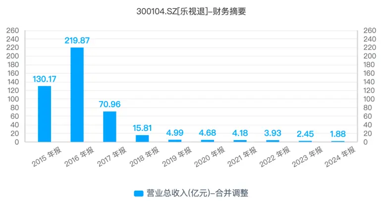 据同花顺iFinD数据,乐视网的业绩在2016年达到顶峰后,便开始持续“跳水”。到2024年,公司全年营收仅为1.88亿元,这一数字甚至不及巅峰时期的百分之一,昔日互联网巨头的光环已彻底褪色。