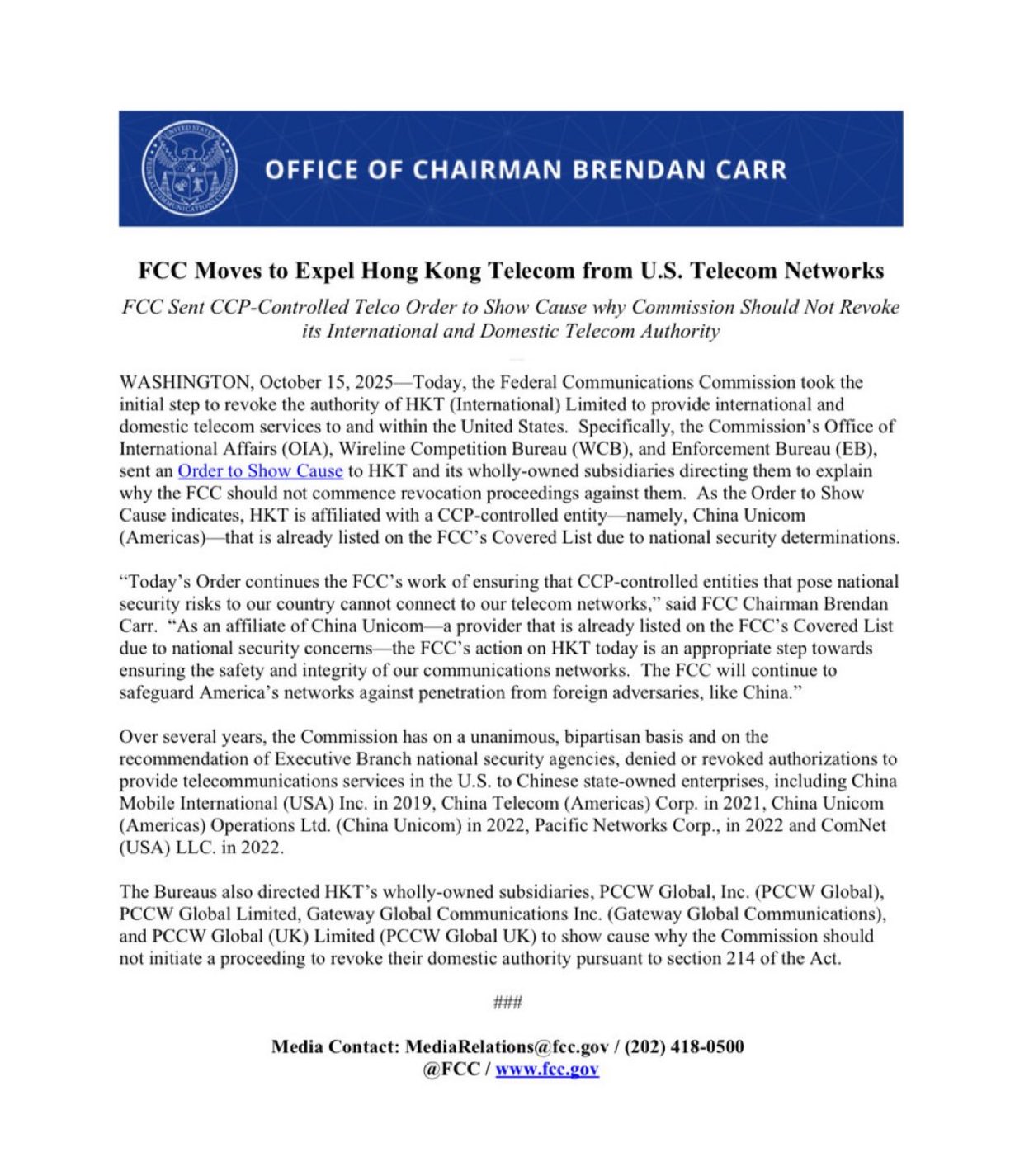 美国联邦通信委员会(FCC)星期三(10月15日)说,出于国家安全考量,正准备撤销香港电讯运营商 HKT International(HKT)在美运营许可授权。根据路透社报道,FCC发布了一份“说明理由命令(order to show cause)”,鉴于HKT公司与中国联通美洲公司(China Unicom Americas)的关联,要求HKT及其子公司提供FCC不应启动撤销程序的理由。