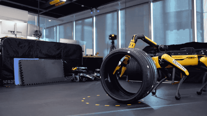 搬运的轮胎重达15公斤,相当于Spot自身重量的一半(32.7千克),并远超其最大臂力。