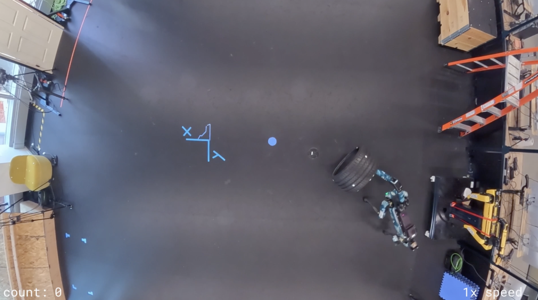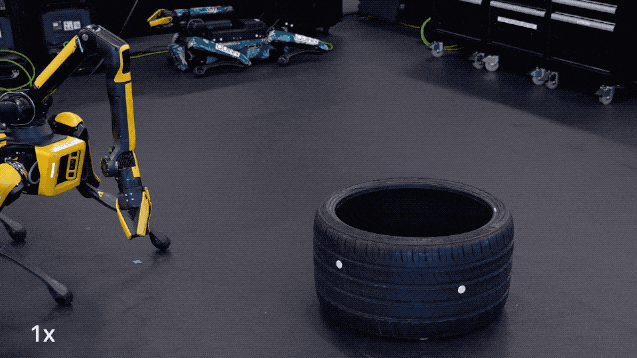 训练得到的轮胎滚动策略使机器人能够动态调整其躯干与Spot Arm的位置,以稳定控制滚动的轮胎,防止其倾倒,并将其引导至目标位置。