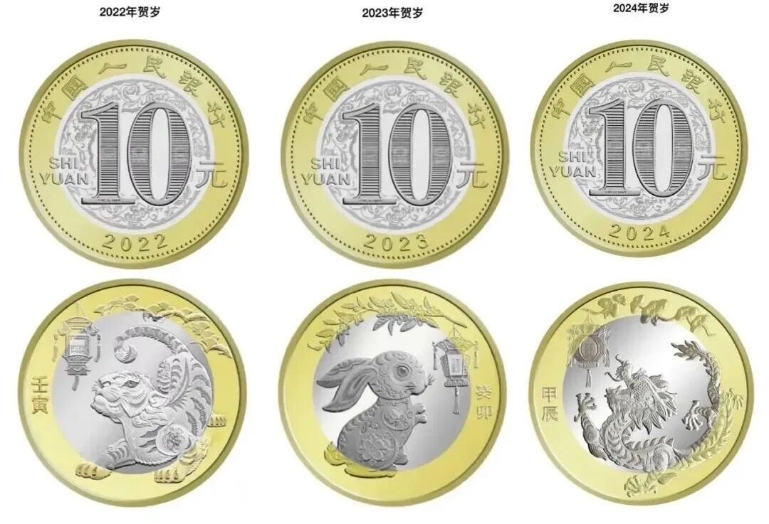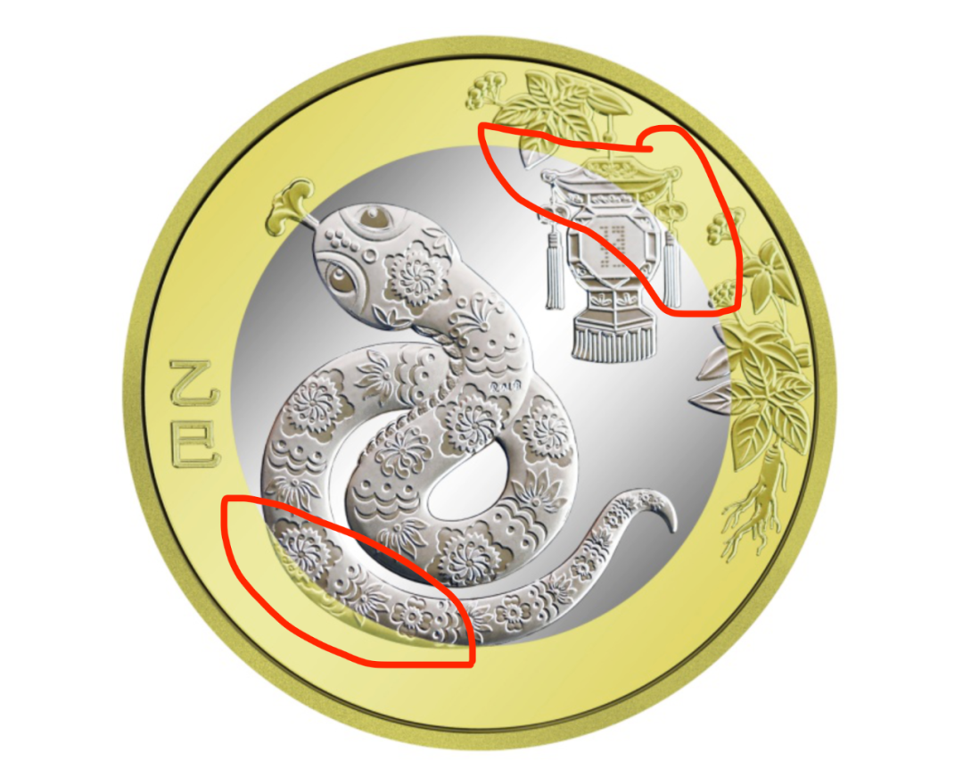看个细节,以下图 2025 年蛇年纪念币为例,压印的图案完美压到了两种颜色的金属上。说明图案是在内芯和外环嵌套成整体后,再一起压印上去的。