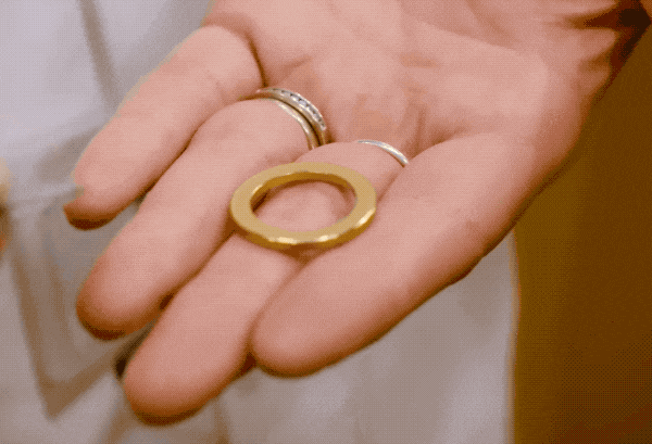 为了方便理解压花机的原理,还是要先用剖面图示意。外环做的比内芯高一点,重压之下,外环变形的金属材料会立马怼进内芯的凹槽中,把它填满。只要算好所有余量,一卡牢就可以让双色金属完美结合了!