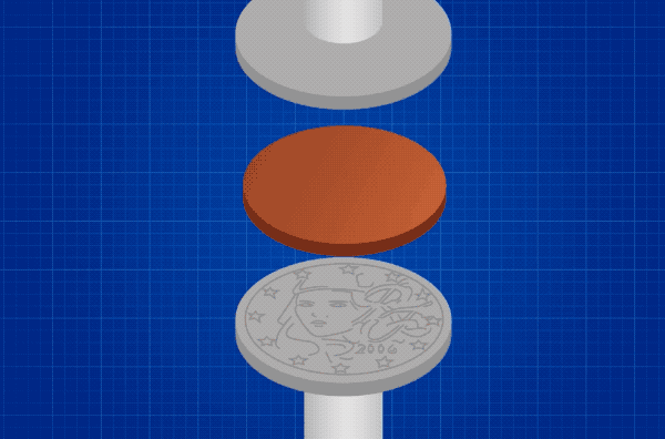上下模具的外表面还分别对应着雕版的图案。请忽略下图的硬币面值,这里就是找了个压印原理的示意图。