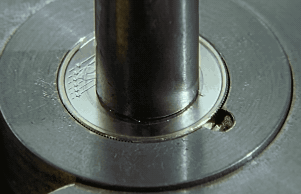 此时还是个小圆饼的内芯,在下方压槽机里走上半圈。这就是双色金属币内芯的重要操作了——给银色的内芯压出一道槽来,方便后面和金色外环嵌到一处永不分离。
