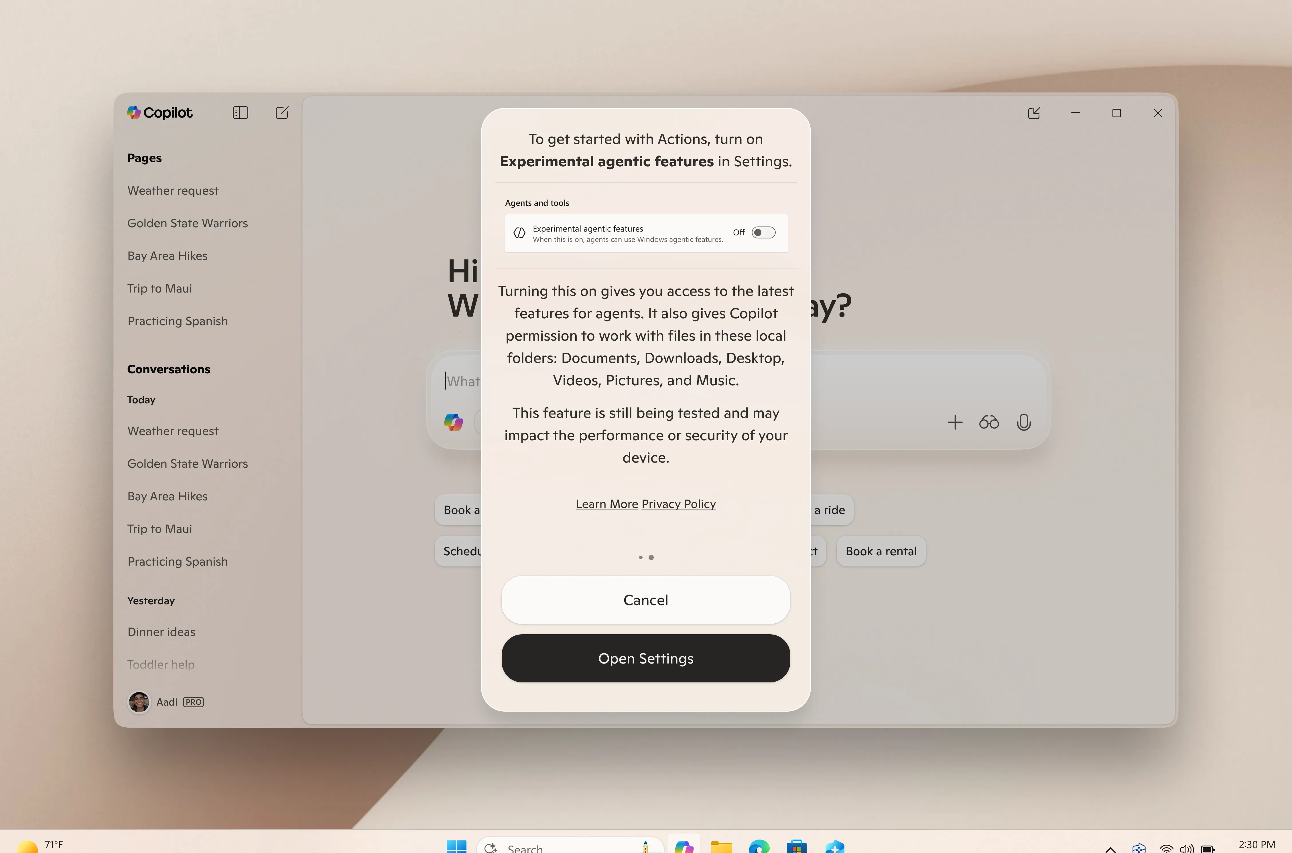 Copilot的下一个阶段是“行动”功能(Copilot Actions),允许AI助手在本地电脑执行操作,如批量编辑照片等。微软已面向部分用户开启此预览版,目前仅限于少量简单场景,以持续优化AI模型。