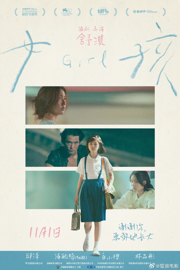 据猫眼电影,由舒淇编剧导演的电影《女孩》今日发布定档海报,将于11月1日全国上映。据悉,《女孩》以1988年的基隆港为故事背景,讲述少女林小丽的成长故事,虽然她的身边有常拿她出气的母亲和酗酒家暴的父亲,但她还是憧憬着更明媚的未来。