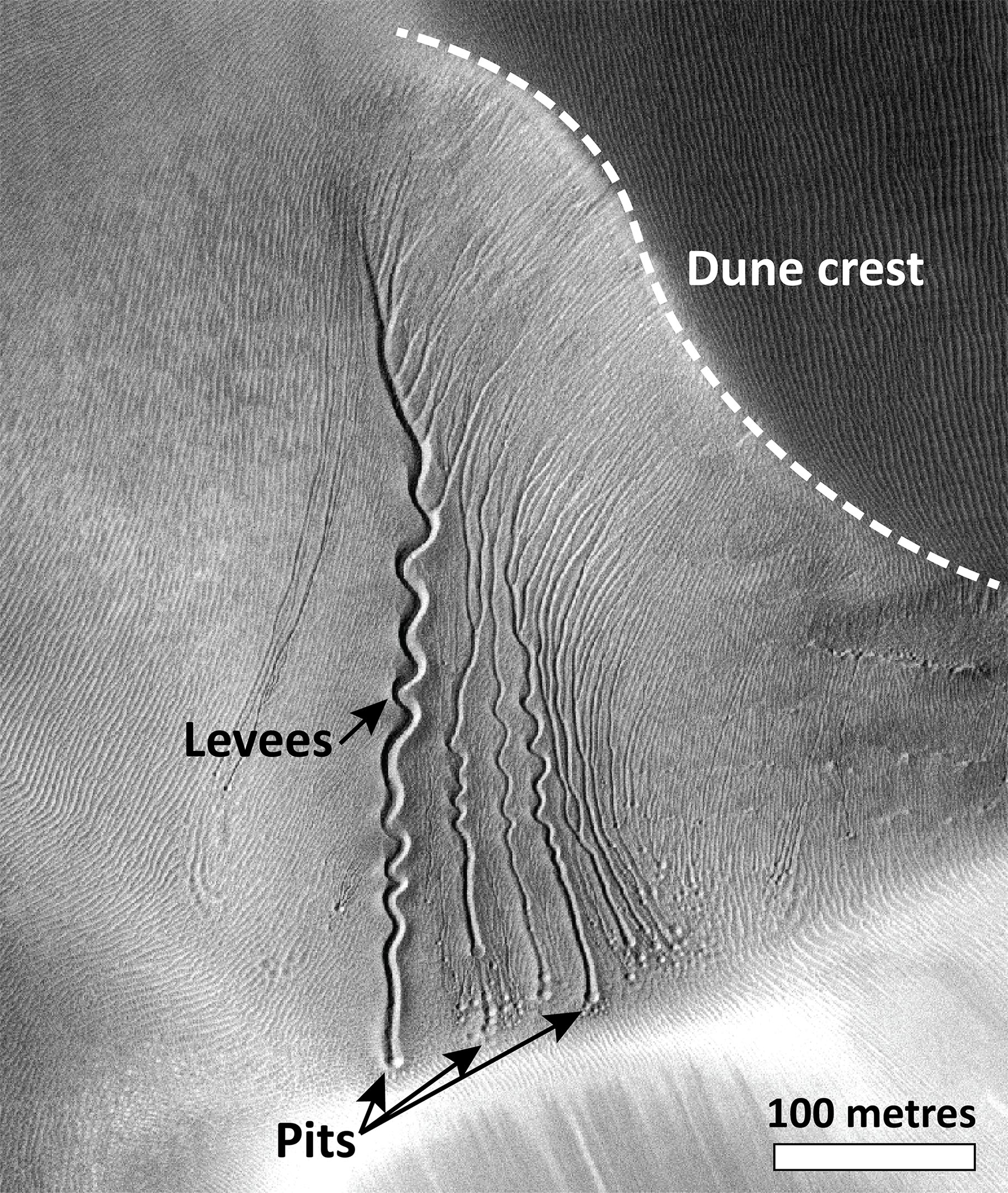 近日,荷兰乌得勒支大学的地球科学家通过实验揭示了火星沙丘上的奇异沟壑的成因。研究显示,这些沟壑并非生命活动所造,而是由冻干二氧化碳(CO₂)块在沙丘上滑落、穿钻形成的,这一过程在地球上从未被观察到。