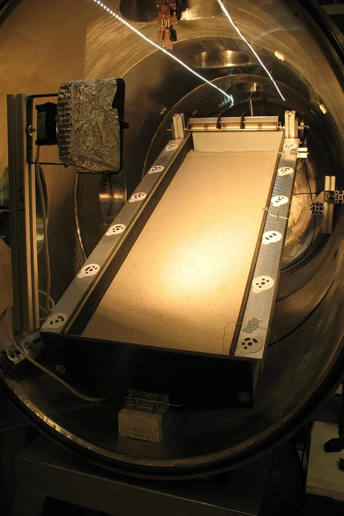 实验中,科学家们在类火星环境下观察到CO₂冰块自发钻入沙丘。“过程非常像电影《沙丘》里的沙虫。”研究者Lonneke Roelofs表示。她的成果已发表于《地球物理研究快报》。