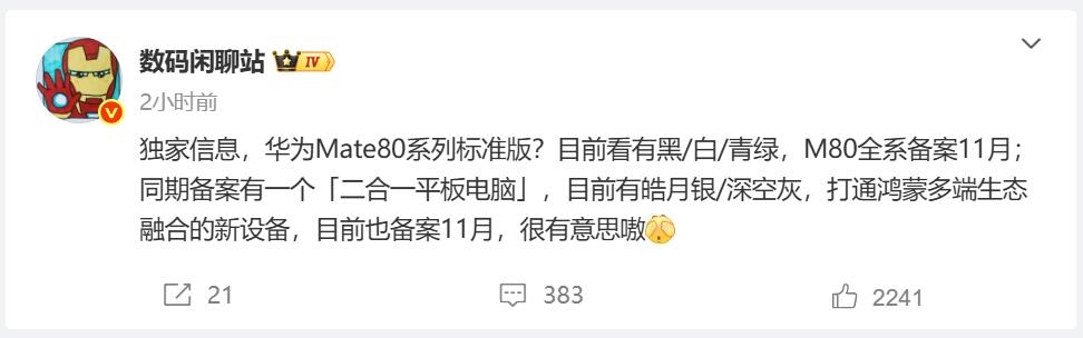 博主数码闲聊站表示,华为Mate 80系列已经备案,新品会在11月亮相,其中Mate 80标准版代号Voyager,提供黑色、白色、青色和绿色四种配色。该博主还透露,同期备案的还有华为平板电脑,有皓月银、深空灰两种配色,这是华为打通鸿蒙多端生态融合的新设备,预计会在11月亮相。