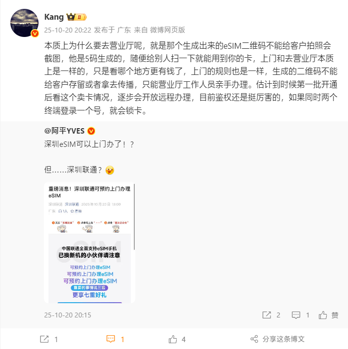 据博主“Kang”透露,目前必须线下开通的原因是,生成出来的eSIM二维码不能给客户拍照会截图,因为任何人扫描后都能使用这张卡,所以必须线下。