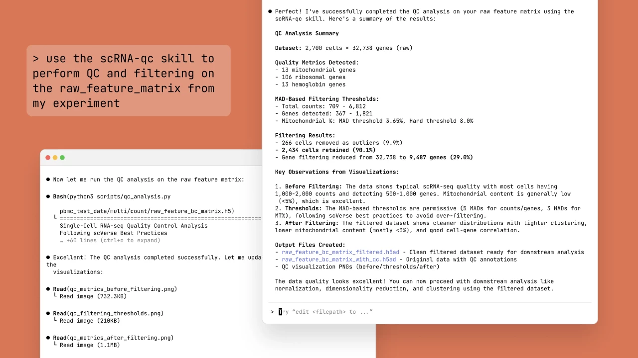 Anthropic还展示了其新发布的Claude Skills功能如何将可重复的科学流程转化为AI自动化工作流。比如,公司开发了一个用于单细胞RNA测序数据自动质量控制的新技能,可显著提升数据处理效率。