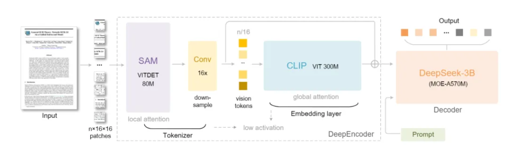 编码器DeepEncoder:负责把图片转成高度压缩的视觉token;