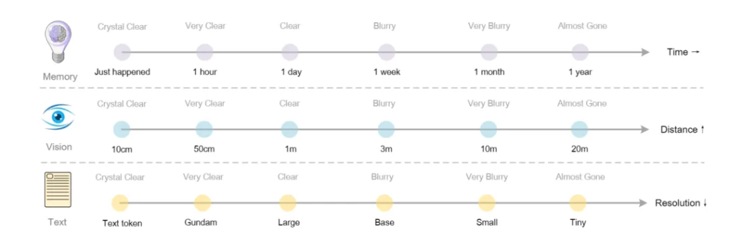 远期记忆 :就像远处的物体,逐渐模糊。所以可以将其渐进式地缩放成更小、更模糊的图像,用更少的视觉token来表示,从而实现信息的自然遗忘和压缩。