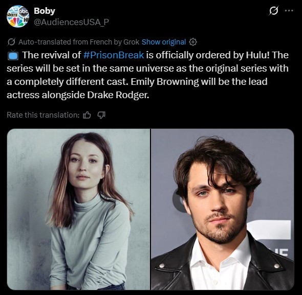 《综艺》杂志报道说,流媒体平台Hulu已批准《越狱》剧集重启。项目始于去年12月,采用原剧世界观但引入全新剧情及角色并完成了试播集拍摄工作。