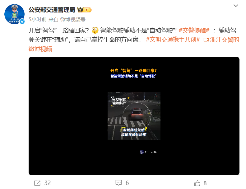 交警提醒,智能驾驶辅助不是“自动驾驶”,辅助驾驶关键在“辅助”,生命安全还得靠“自主”。