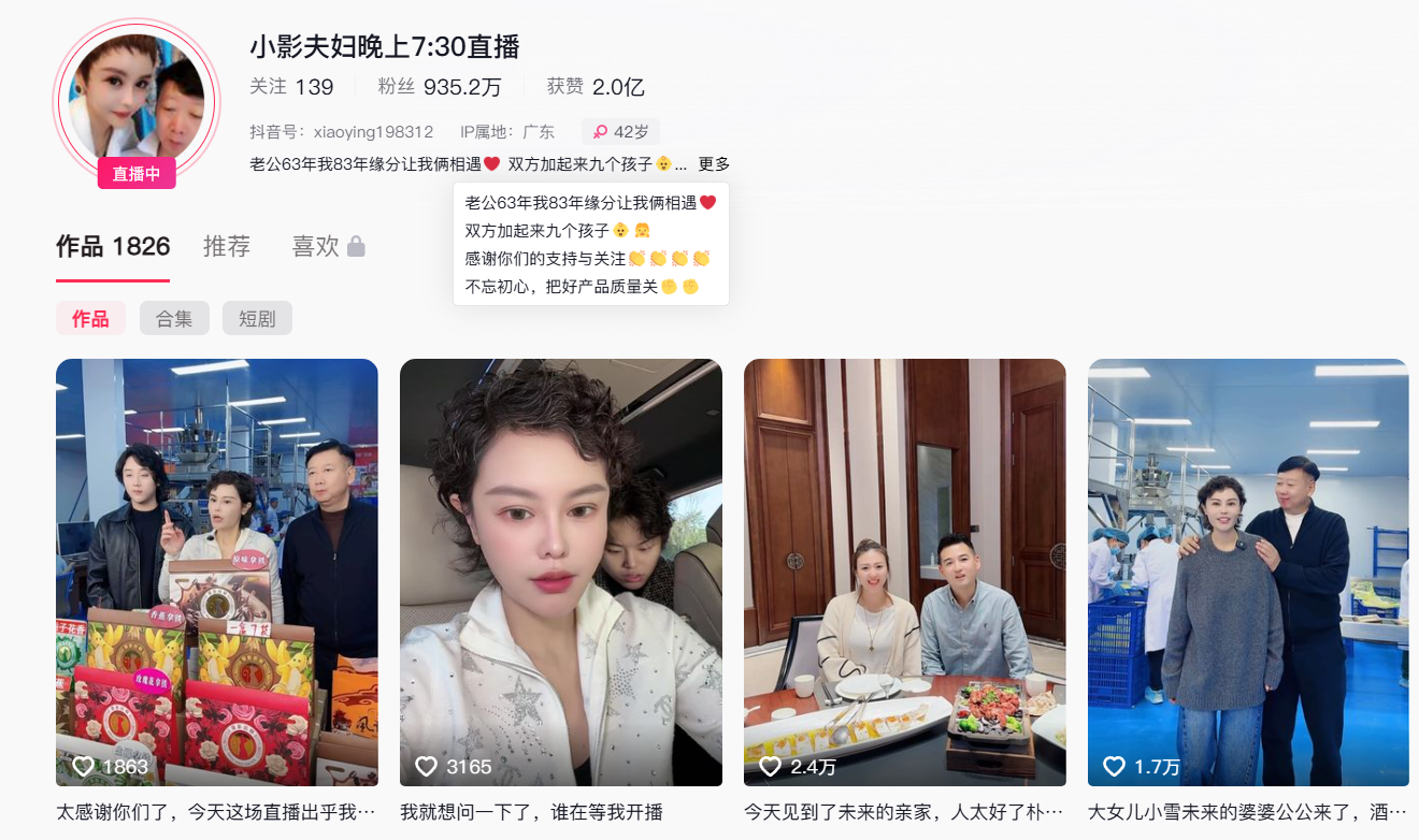 目前,“小影夫妇”账号仍正常直播带货,单平台粉丝达935万,账号实名认证为丁影影。