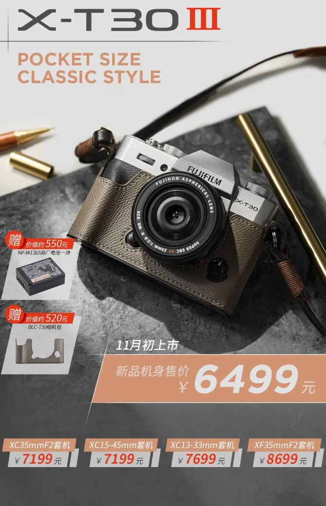 今天,富士胶片正式推出轻便型无反相机X-T30 III,单机身定价6499元,将于11月初上市。这款延续复古基因的新机,支持一键切换经典色彩模式,涵盖还原真实质感的“REALA ACE”、复古浓郁的“NOSTALGIC Neg.”等热门配方。