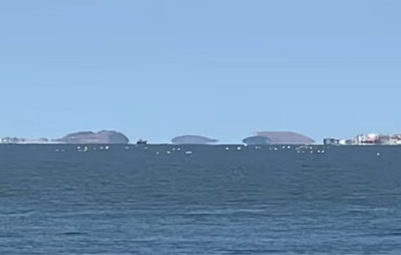 在最新发生的这起案例中,海水温度17℃与气温24.4℃的7℃温差,正是触发海滋的关键条件,而轻淡的平流雾(暖湿空气移经冷海面形成)为海滋提供天然 "幕布",加上当天东北风2-3级,气压1015.5毫巴,为光线稳定折射创造了理想条件。
