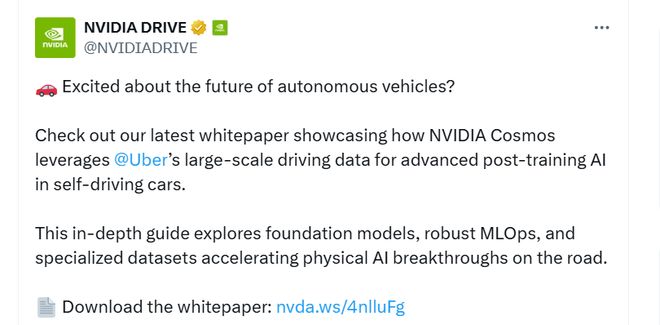 据英伟达称,此次合作的重点在于利用优步从各种场景(包括机场接送、复杂路口以及不同天气状况)中收集的大量真实驾驶数据来训练英伟达的Cosmos World基础模型。