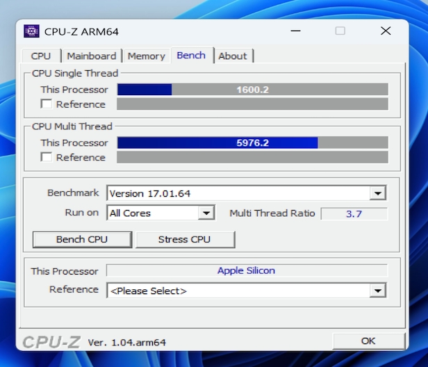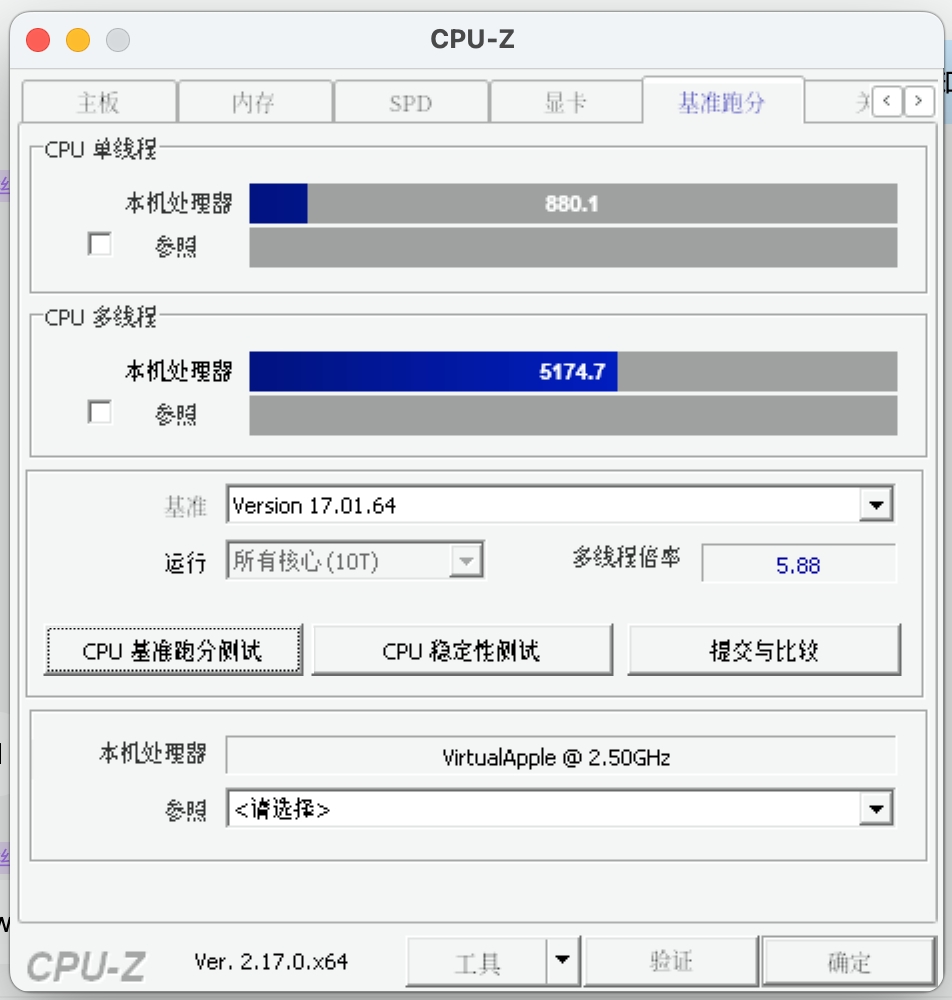 不过注意,CPU-Z并没有原生的苹果系统版本,所以这样测试必然会有性能损失。
