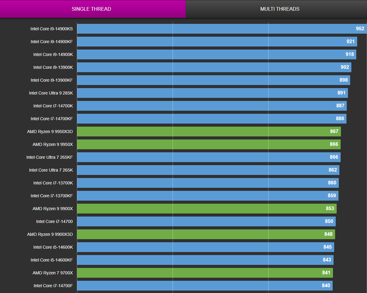 作为对比,AMD、Intel最高都还不到1000分,最好的是i9-14900KS 952分,另外锐龙9 9950X3D 867分、酷睿Ultra 9 285K 891分。