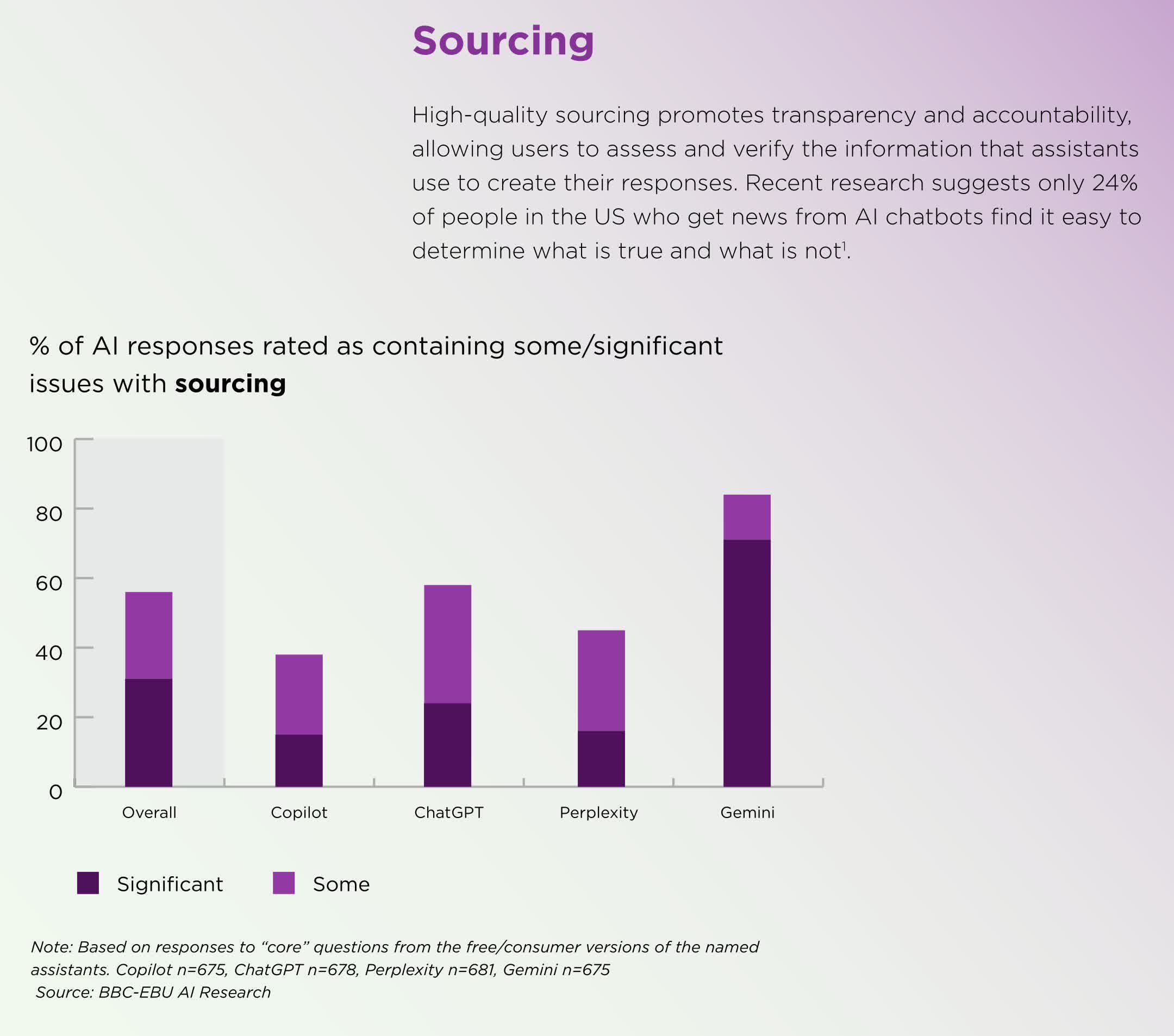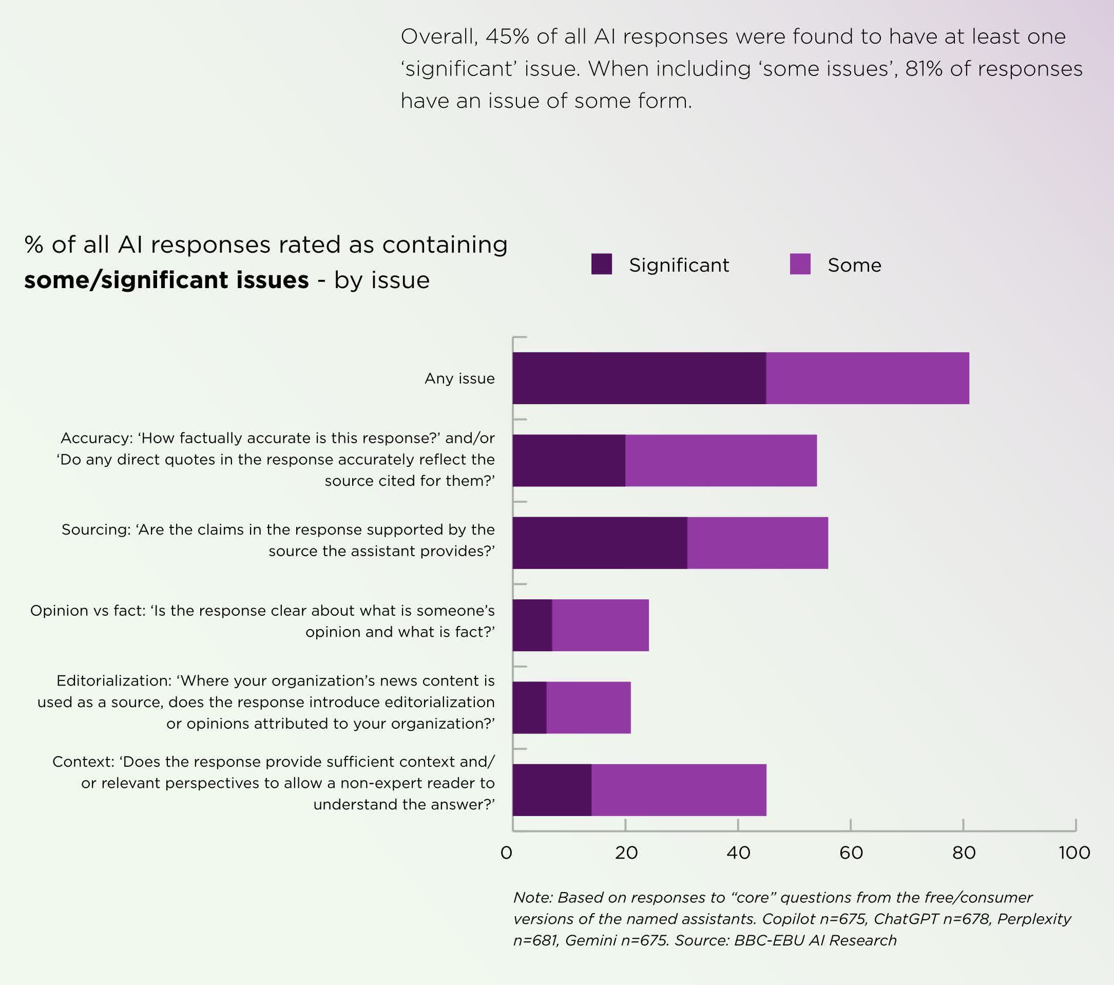虽然相比今年2月BBC单独测试时,严重错误比例已从51%下降至37%,但Gemini仍明显落后于其它产品。尽管结果表现不佳,研究人员发现英国公众对于AI新闻摘要表现出较高信任度:超过三分之一英国成年人、近半数35岁以下人士相信AI能准确总结新闻内容。有42%的公众表示,当AI误传原新闻内容时,会同时质疑新闻机构本身的可靠性,或者降低对其信任。专家警告,如果此类问题持续存在,生成式AI工具日益流行可能严重损害主流新闻机构的声誉与公信力。