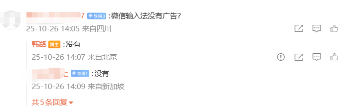 有网友在评论区问道 “微信输入法没有广告?”,韩路随即回应 “没有”。