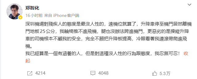 日前,歌手郑智化微博发文怒斥深圳机场对残疾人的态度没人性,升降车离机门地板25厘米,他的轮椅推不进飞机,腿也跨不进机舱门。操纵升降车的司机完全不愿把升降板提高,冷眼看着他连滚带爬进飞机。