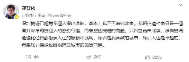 今天凌晨,郑智化表示,深圳机场已对他个人提出道歉,基本上他不再追究此事。