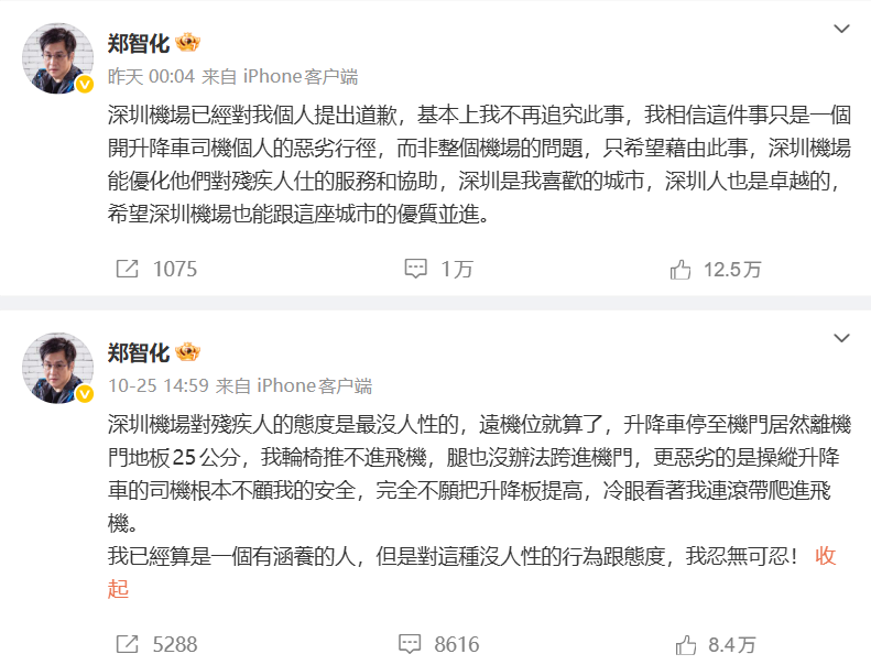 10月25日,郑智化在社交平台发文称,称深圳机场对残疾人的态度是最没人性的。自己在深圳机场乘坐航班的时候,升降车升至机门后离机门地板有25厘米距离,导致其轮椅无法推入飞机。而操纵升降车的司机不愿把升降板提高,冷眼看着他“连滚带爬”进飞机。