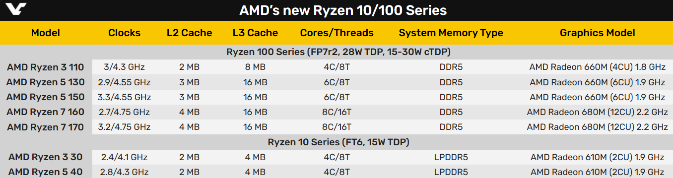 锐龙5 130:也就是锐龙5 7535U,6核心,2.9-4.55GHz频率,3+16MB缓存,Radeon 660M,热设计功耗28W。
