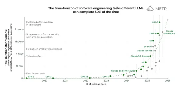 比如熟练的程序员需要15分钟搭建一个简单的网络服务器,这事儿GPT-5能做。但找到程序里一个漏洞,程序员耗时不到一小时,AI也能做到,但成功率只有大约一半。